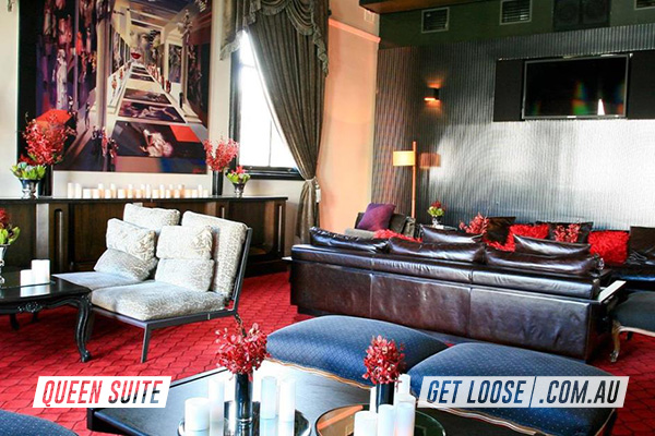 Our penthouse style venue features 2 elegant private rooms located on the top level of a 3-story heritage venue in the nicest part of the Sydney CBD at the Rocks. Each lavish room is decorated with Spanish interiors including plush lounges, large mirrors, plush red carpet and curtains, with high pressed metal ceilings to present a royal setting. One of the rooms features a private balcony with views. Exclusive to Get Loose.